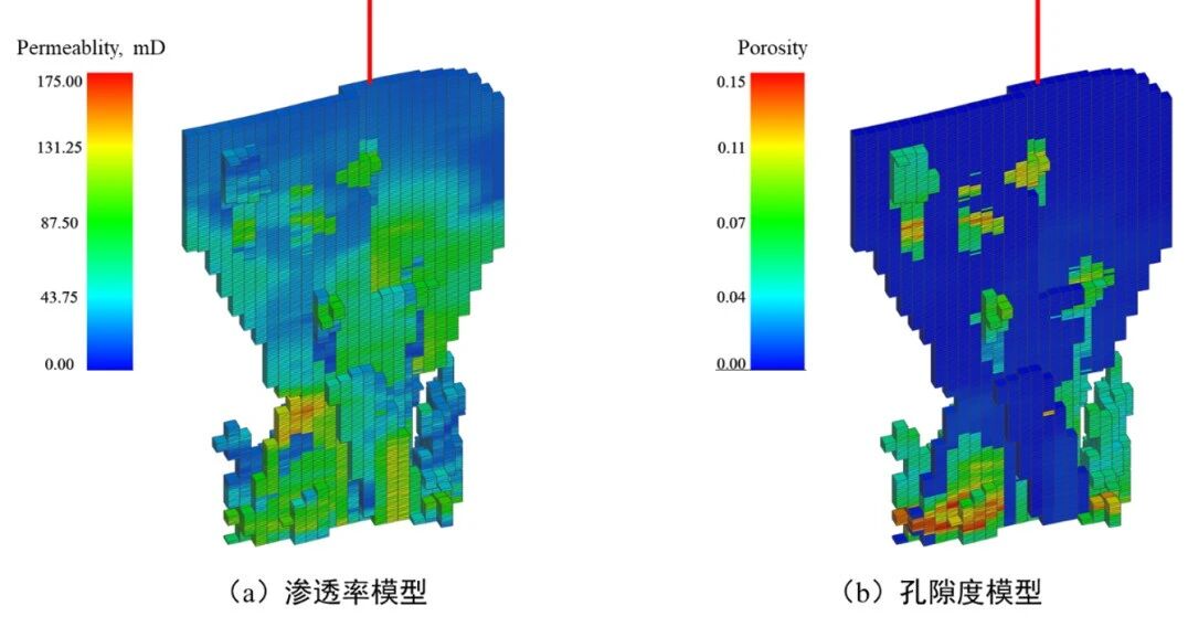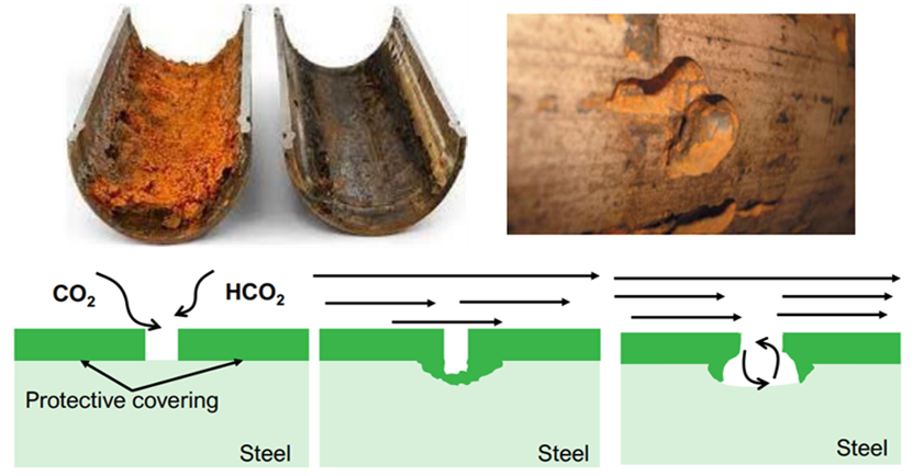 CO2腐蚀可能发生在井筒结构的多个部件上:油管、油管接箍、电潜泵(ESP)部件、电缆。该过程可分为三个连续阶段:首先,钢基体由“保护覆盖层”屏蔽,该覆盖层可以是钝化膜、腐蚀产物层(如碳酸亚铁 FeCO3),或人工涂层。该覆盖层存在局部缺陷,使下方钢材的小面积暴露。环境中的 CO2溶入水相,生成具有腐蚀性的物种,如碳酸(H2CO3)。腐蚀是金属与环境自发发生的化学反应,会导致金属性质或金属结构发生改变。为定量评估腐蚀,使用腐蚀速率。腐蚀速率既可以理解为单位时间内的腐蚀渗透深度,也可以理解为单位表面积上的金属平均腐蚀量速率。腐蚀速率vcor可按 de Waard 公式[1]计算:其中:vr 为反应速率(mm/年),vm,t为传质速率(mm/年)。反应速率vr计算式:其中:T 为发生该反应的环境温度;fCO2为 CO2 的逸度;pHCO2为由 CO2决定的氢离子活度对应的 pH;pHact 为实际 pH。当给定 pHact时,计算 pH 时采用该值;若未给定,则根据 CO2浓度计算 pH。其中:pCO2 为 CO2的分压,p 为环境压力。pH(pH = −lg[H+])用于表征环境酸度,其基于 CO2的估算为:其中:d 为井筒管柱的管径,vm为特征流动参数(与流动-传质有关的速度尺度)。该模型在引入温度与逸度依赖性后,仍是油气系统 CO2腐蚀初筛的实用标准,并通过传质修正以反映流动效应,会将 FeCO3薄膜的沉积与防护性作为温度、pH 与 Fe2+的函数纳入考虑。参考文献: [1] de Waard, C., & Lotz, U. (1995). Influence of liquid flow velocity on CO2 corrosion: A semi-empirical model. Corrosion, 51(10), 721–736.tNavigator模拟器中,油藏-井筒一体化模型耦合的工作流按如下方式进行(图2)。储层模型由压力、温度、饱和度分布和PVT初始化。定义完井和井斜测量、油管/套管尺寸和热性能(流体、管道、水泥、地层)。设置EOS参数和腐蚀模型设置。这包括定义一系列pH情景(从pH=7到pH=1),以研究地层水化学或酸化等操作干预可能引起的中性、中酸性和高酸性条件的影响。采用顺序迭代方法,在每个时间步,储层模拟器(tNavigator)根据当前边界条件计算流向井筒的流体流量。然后,井筒模型使用这些流入速率和成分来计算沿油管的压力、温度、流态和相的垂直剖面。在每个深度,EOS闪蒸确定相组分和摩尔分数,从而产生局部CO₂ 分压(pCO₂). 根据局部流体速度和特性计算流态、壁面剪切应力。最后,使用pCO₂确定腐蚀速率(vcor),将反应动力学(式4)与传质模型(式5)相结合。该过程为每个时间步生成腐蚀曲线,从而可以计算随时间推移的累积金属量损失。采用西部某油田高温高压断溶体油藏中的某一口井为实例进行测试。分别建立了油藏模型、井筒模型(图3)。对单井进行了历史拟合,计算了pH=7时的油管腐蚀曲线(图4),给出了在中性盐水工况(pH=7)下,沿油管的预测腐蚀速率 vcor(z,t),所选时间覆盖脱气前与脱气后的代表性阶段。井筒早期,储层总体未达饱和,入口气相占比低,管内流型以泡状/段塞流为主,壁面剪切力处于中等水平。靠近井底温度较高,促进了反应动力学(vr);但在高压下,pCO2主要受溶解 CO2控制,传质增强(vm,t)仍较有限。结果是大部分油管段的腐蚀速率偏低至中等,通常约为0.1–0.4 mm/年。局部峰值可能出现在完井(射孔)段附近,因湍动与混合提升了传质,但受限于游离气含量较低,这些峰值幅度有限。随着油藏进一步枯竭并进入明显脱气阶段,产出气中的 CO2气相摩尔分数升高,同时气相体积分数扩大,使上部油管段的气体流速加快。这些变化使流型向搅动/环状流转变,尤其是在压力降至低于气泡点之上的井段。在该流型下,壁面剪切应力与界面更新率显著提升,推动vm,t 大幅上升。即使 vr仅有温和变化,由于传质项占主导,整体腐蚀速率 vcor也可能成倍(2至4倍)增加。模拟显示,在向环状流过渡的井段,vcor提升至约0.6–1.2 mm/年。